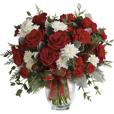 Give the gift of holiday style with this mix of Christmas crimson and winter white blooms, all wrapped up with a festive plaid ribbon in a classic ginger jar.