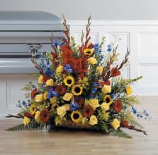 Send comfort to the family with these abundant flowers beautifully contained in a wicker basket. Lavender and white chrysanthemums mix with pink alstroemeria and carnations.